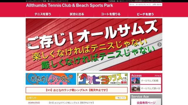 | タイトル | トップページ - 千葉県船橋・鎌ヶ谷のテニススクール | Allthumbs Tennis Club オールサムズテニスクラブ |