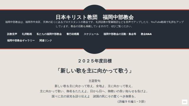 | タイトル | 日本キリスト教団 福岡中部教会 – 福岡中部教会は、福岡市中央区、天神の近くにあるプロテスタントの教会です。礼拝説教や聖書朗読などを音声でアップしたり、YouTube動画で礼拝をアップしています。教会の活動も掲載していますので、ぜひご覧ください。 |