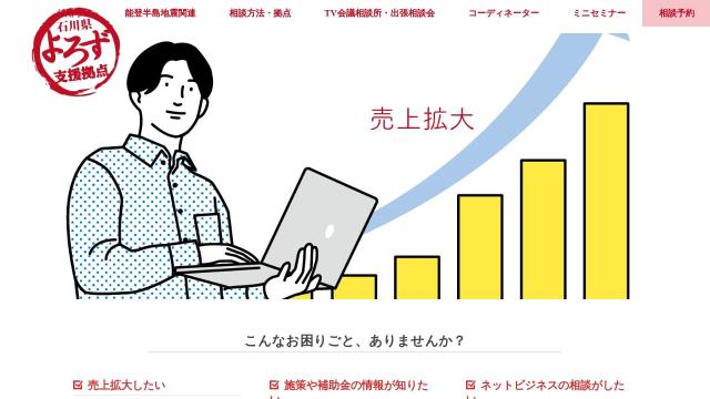 | タイトル | 石川県よろず支援拠点 – 国が設置する無料の経営相談所です。中小企業・小規模事業者・創業予定の方の、売上拡大や経営改善などの相談に対応しています。 |