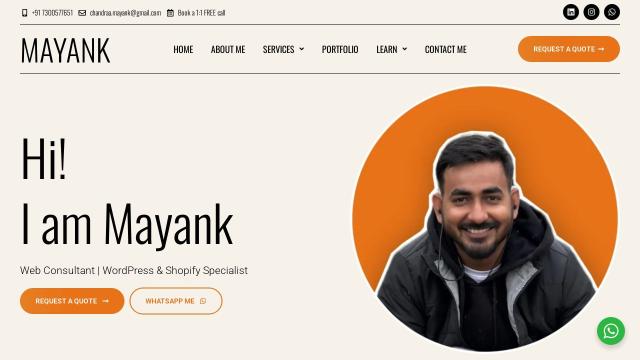 mayankchandra.com 2026-02-24 Favorite0TitleMayank Chandra – Web Consultant | WordPress & Shopify SpecialistHomepagehttps://mayankchandra.com/LanguageEnglish (en)CountryUnited States (US)CMSWordPressWordPressHostingHostingerHostingerThemeAstraAstraPluginsAll in One SEO – Powerful SEO Plugin to Boost SEO Rankings & Increase TrafficConverter for Media – Optimize images | Convert WebP & AVIFelementor-ai.elementor-one.Elementor ProElementor Website Builder – More Than Just a Page BuilderElementorFluent Forms – Customizable Contact Forms, Survey, Quiz, & Conversational Form BuilderFluentSMTP – WP SMTP Plugin with Amazon SES, SendGrid, MailGun, Postmark, Google and Any SMTP Providerhfe.nps-survey.Premium Addons for Elementor – Powerful Elementor Templates & WidgetsPRO ElementsUltimate Addons for ElementorWP Chat AppSite TypeCorporateColorYellowPage Speed4,610 msec WP-Search analyzes from public information on websites.Information may not be 100% accurate.Some plugins cannot be detected, and some plugins have poor detection accuracy.It is cached for a certain period of time to reduce load.