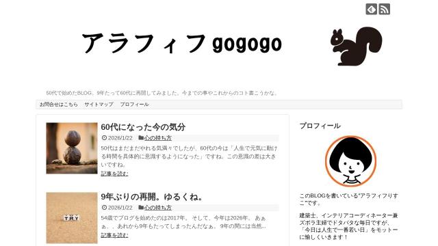 | タイトル | アラフィフgogogoのその後 | 50代で始めたBLOG。9年たって60代に再開してみました。今までの事やこれからのコト書こうかな。 |