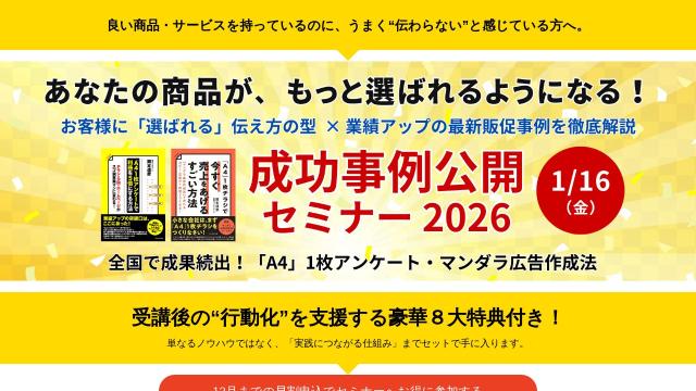 | タイトル | 「A4」1枚アンケート・マンダラ広告作成法/ 販促成功事例公開ZOOMセミナー2026 |