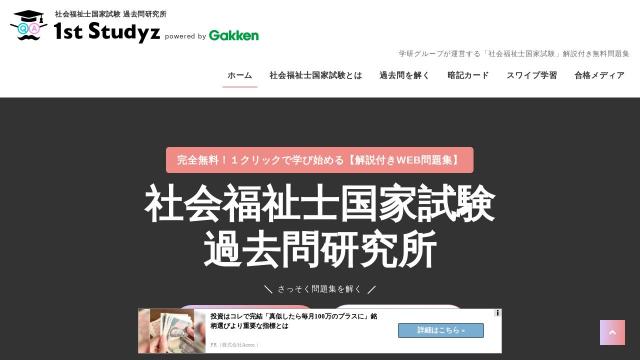 | タイトル | 社会福祉士国家試験過去問 1st Studyz|国内最大級の無料問題集 – 学研グループ運営・掲載数国内No.1の過去問学習サービス |