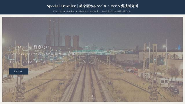 | タイトル | Special Traveler|旅を極めるマイル・ホテル裏技研究所 | 多くの人とは違う旅を選び、違う視点を持つ。非日常を愛し、旅から得た気づきを周囲に還元する。 |