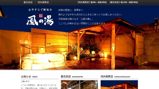 | タイトル | 風の湯 | 心やすらぐ旅気分、大阪の天然温泉「風の湯」です。自然の恩恵に、四季折々、旅のようなやすらぎのひとときを、ごゆっくりお楽しみください。天然の温泉が織りなす”上質の癒し”ここでしか味わえない空間がここにはあります。 |