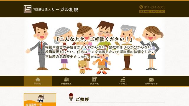 | タイトル | 司法書士法人 リーガル札幌 | 司法書士法人 リーガル札幌では、相続手続や遺言状の作成、会社の設立や不動産の名義変更などに伴う手続きをお客様の親身になってお手伝いをさせていただきます! |