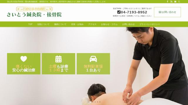 | タイトル | さいとう鍼灸院・接骨院 | 流山市の完全予約制・隠れ家的鍼灸院・接骨院です。東洋医学と西洋医学を融合させた施術で身体の内側から元気にします。 |