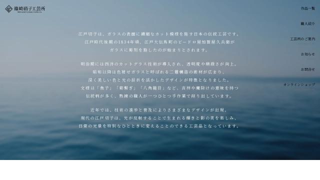 | タイトル | 江戸切子の工房|篠崎硝子工芸所 | 1957年創業の江戸切子専門工房・篠崎硝子工芸所。伝統文様と独自デザインを融合し、光の反射まで計算された美しい江戸切子を制作。三代にわたり受け継がれる確かな技術と品質で輝き続ける作品を生み出しています。江戸切子の工房|篠崎硝子工芸所 |